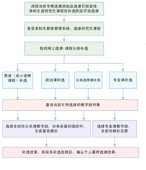| 补(退)选阶段 | 9月3日8:30-9月16日9:00 | 全校性公共课程有容量即选即中,没容量可先候补,等有人退选后按先后顺序自动补选;学院(系)专业课程全部为候选志愿。具备选课资格的本科生在此阶段可选修研究生课程。 |