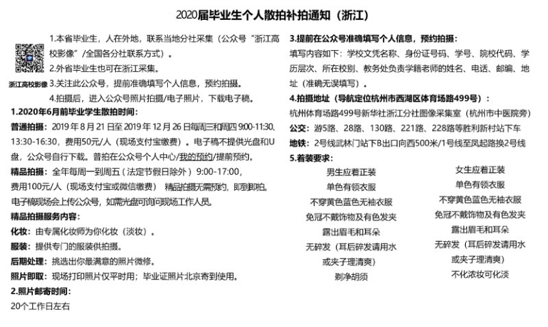 2、本次图像信息采集用于研究生毕业证书、学位证书和国家学历学位认证平台(学信网)的个人图像信息,统一由新华社浙江分社图像采集中心负责拍摄、上传电子版到学信网,收费20元/每人(现金、支付宝均可),提供2寸4张及1寸8张纸质照片一版,每一位研究生只能拍摄一次。
